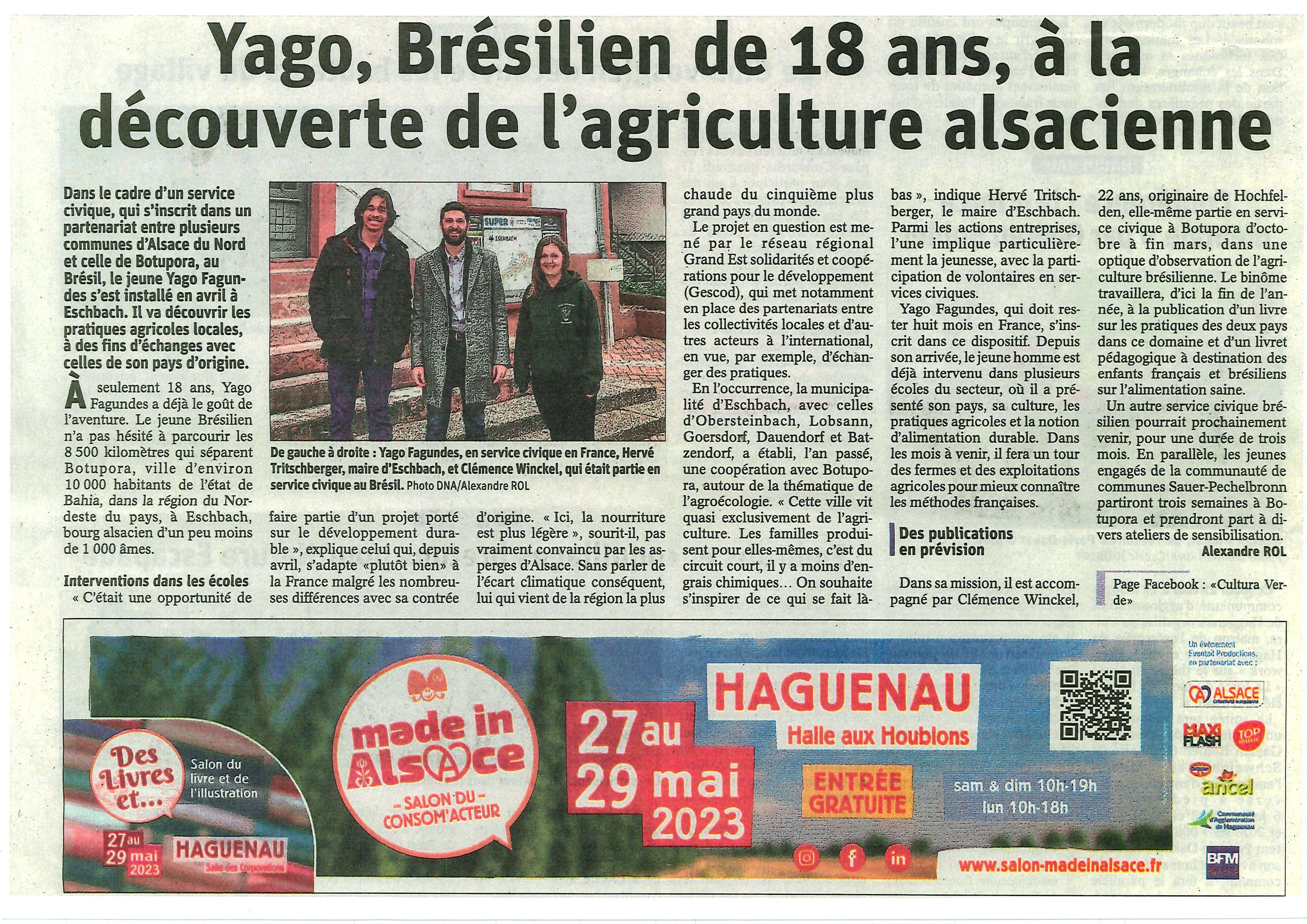 Accueil du volontaire de Service civique Yago Fagundes pour 8 mois accompagné d’une autre volontaire Clémence Winckel afin de récolter des témoignages d’agricultrices et agriculteurs du territoire. Yago et Clémence sont passés également dans les écoles des communes partenaires pour parler d’alimentation saine et durable.