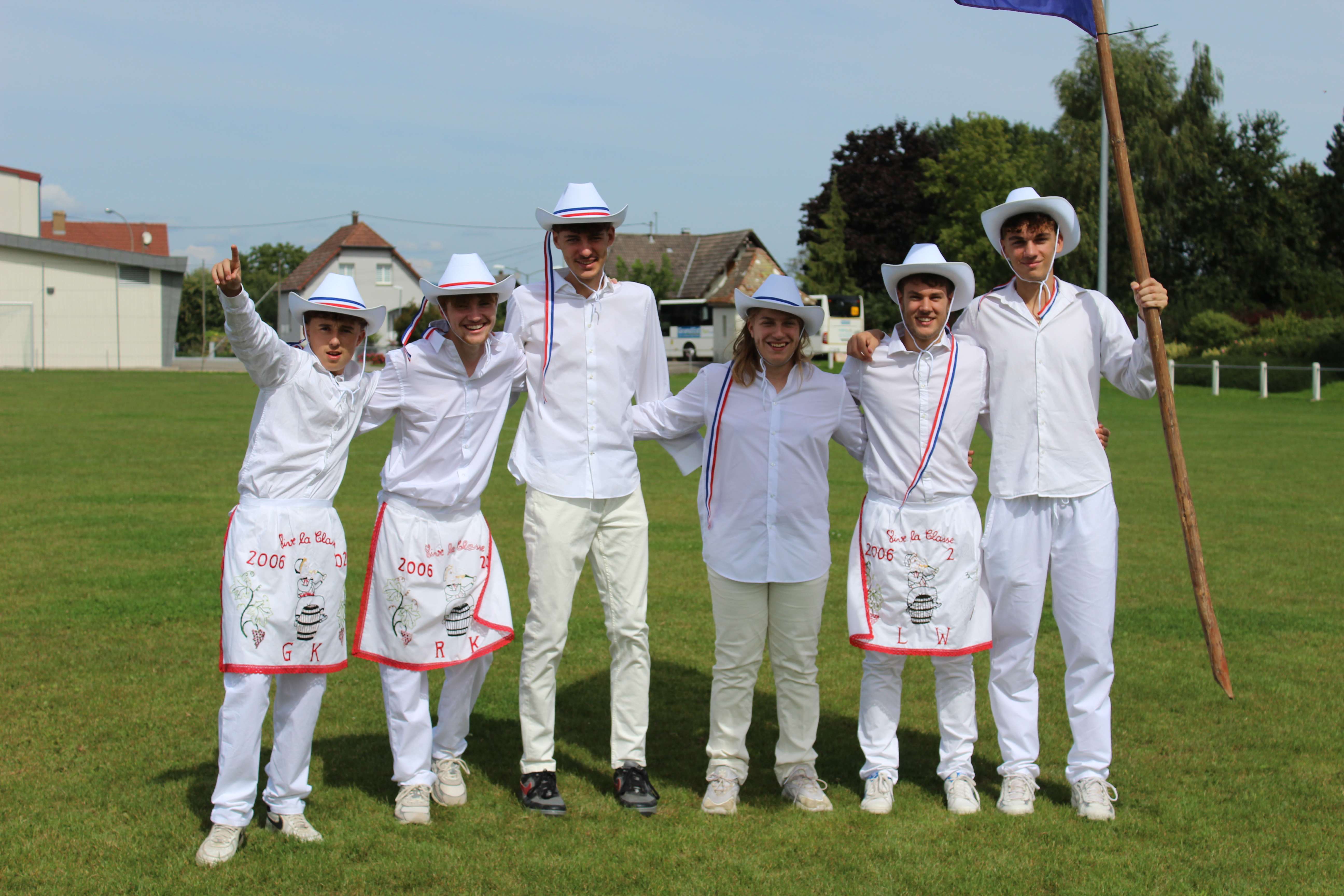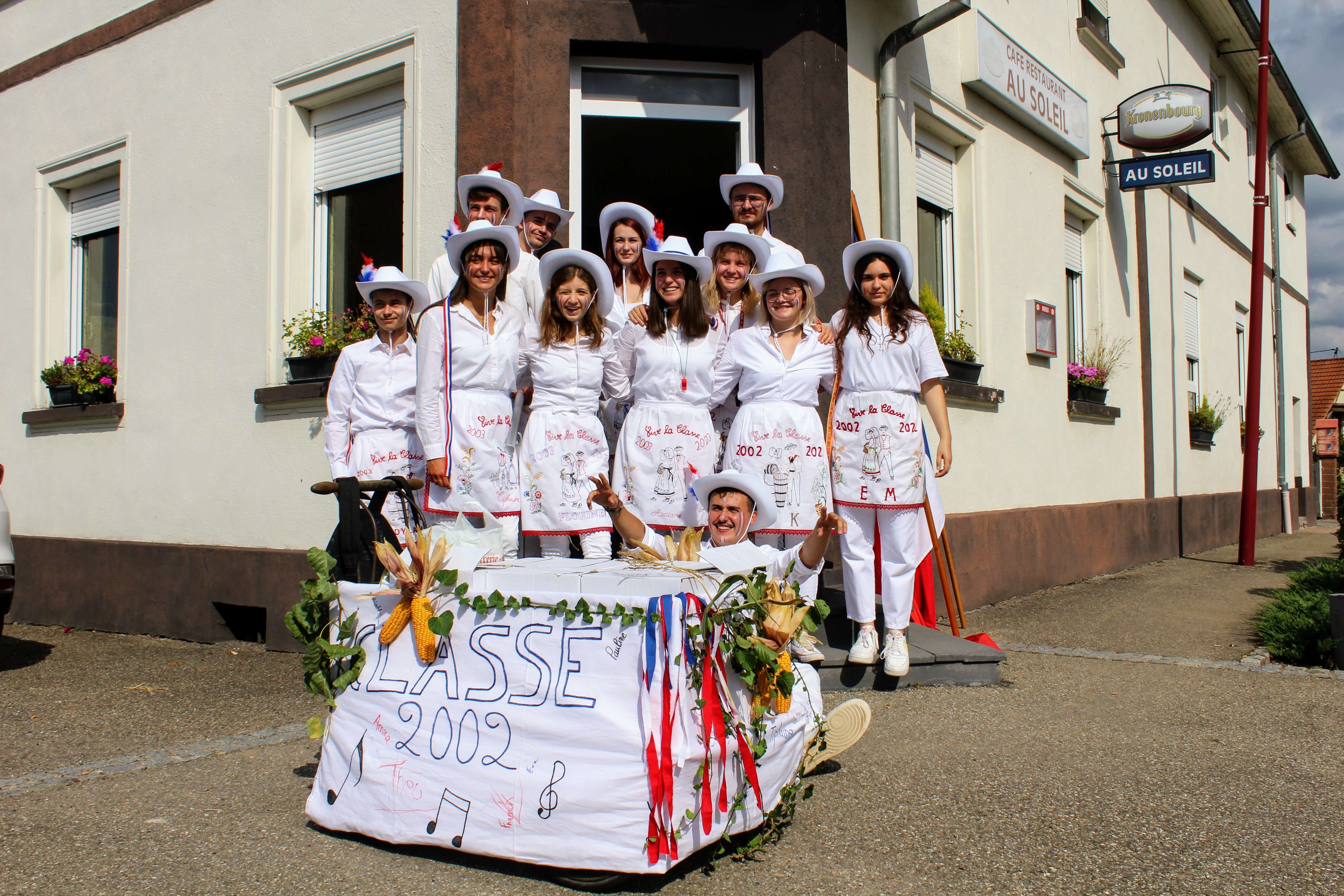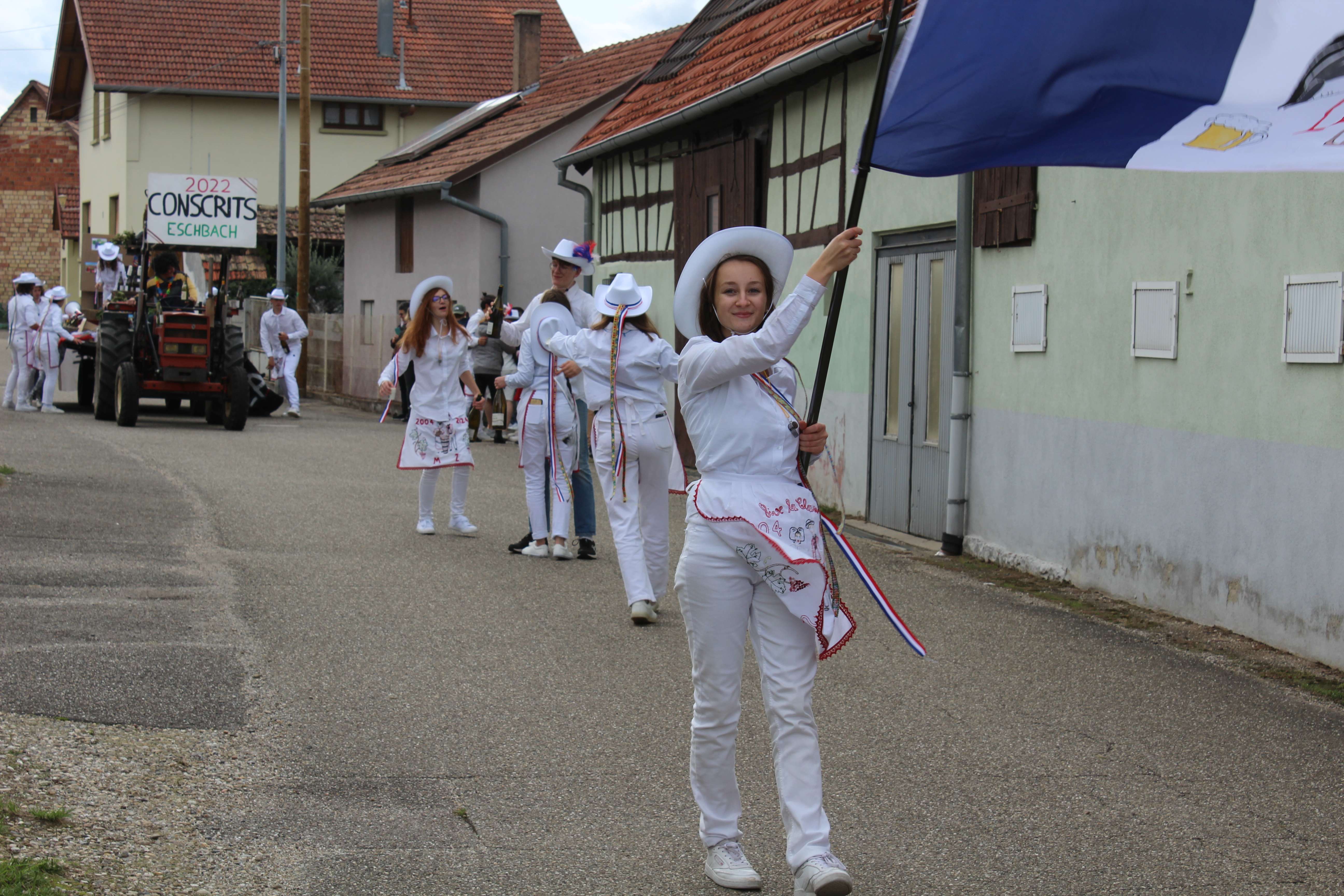 Les conscrits portent un pantalon, une chemise et un chapeau blanc, décoré de rubans et de plumes. Un tablier, brodé aux initiales du conscrit et de son année de naissance et orné de décorations représentant l'alsace complète la tenue.