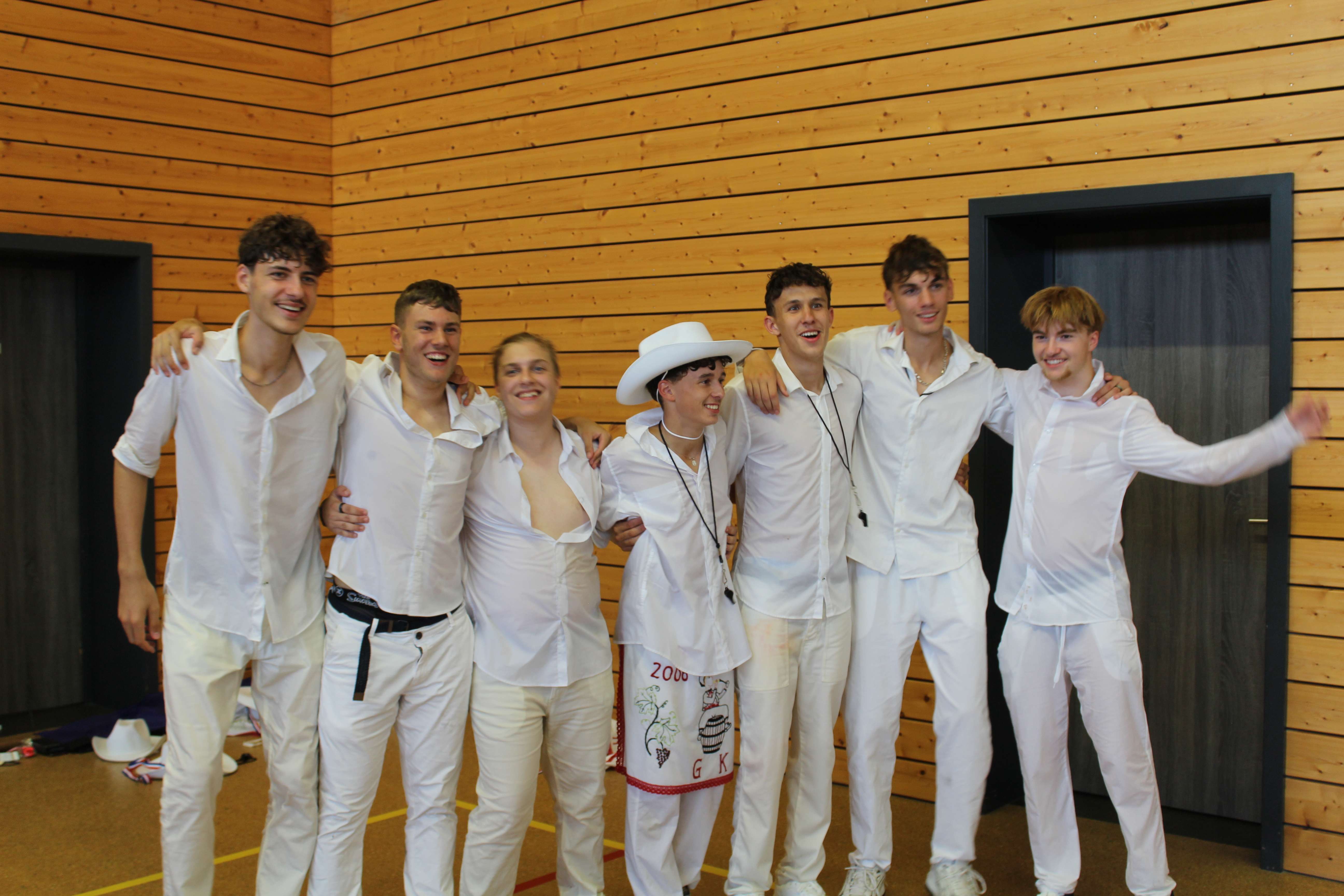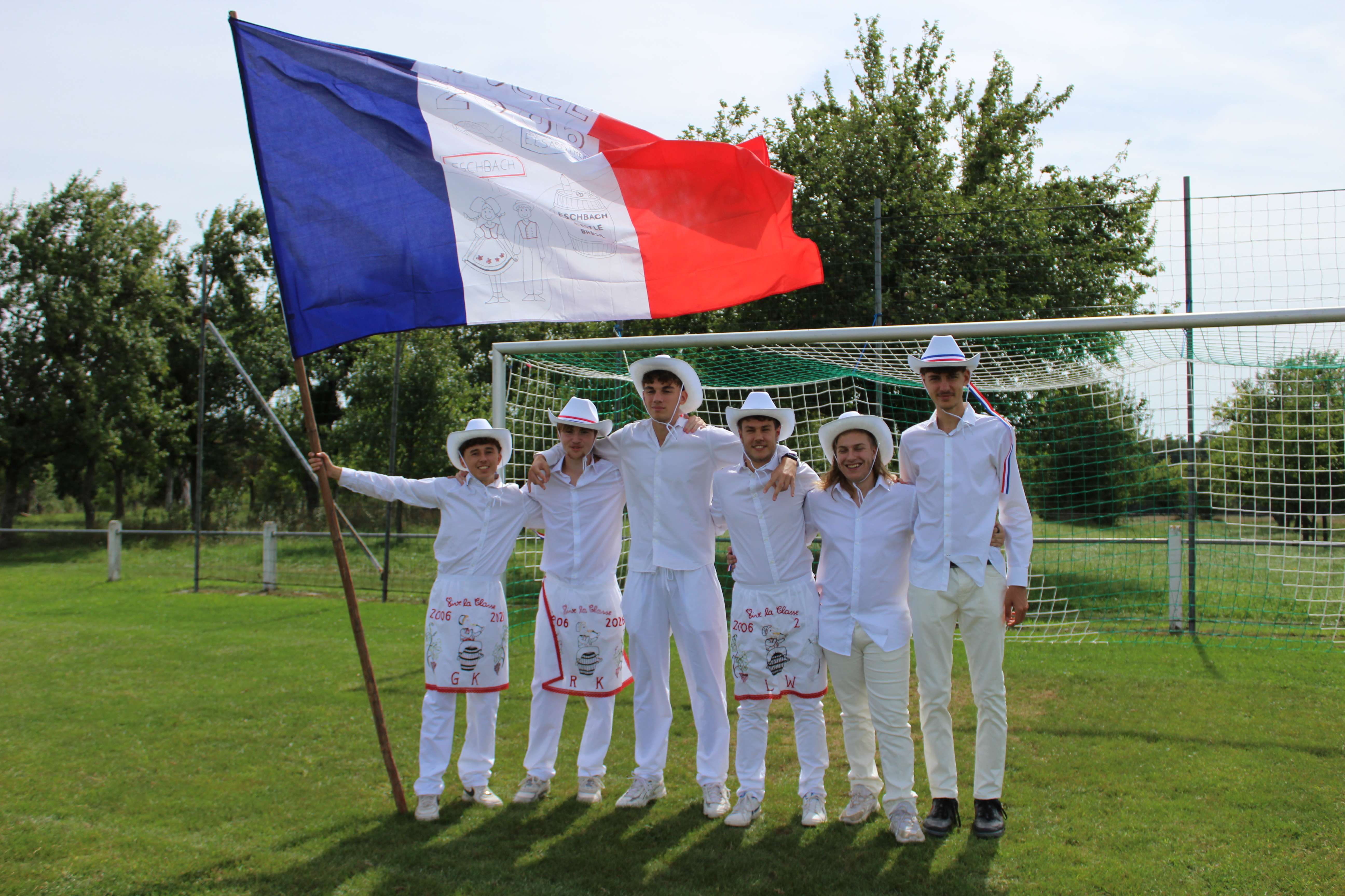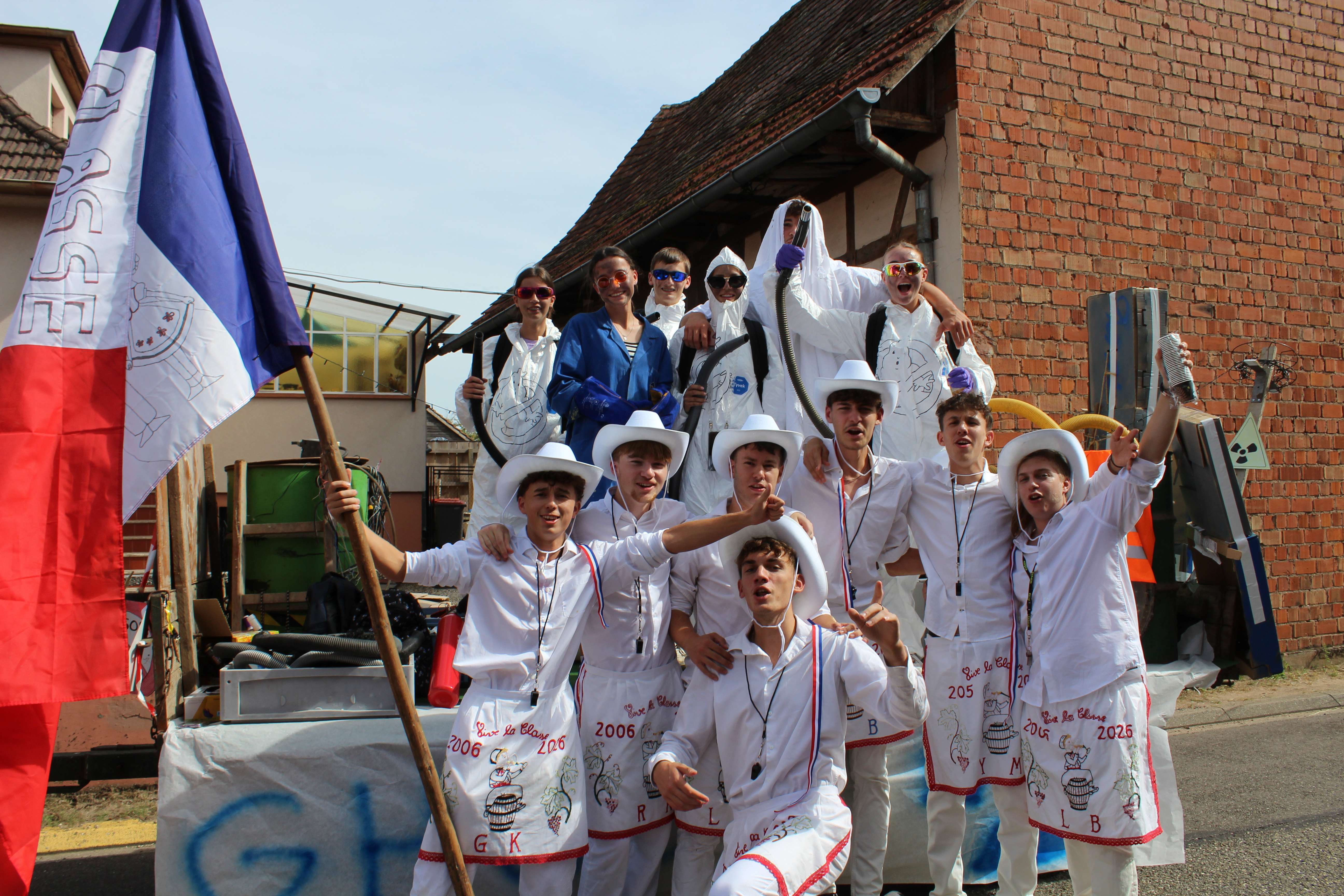 Les conscrits portent un pantalon, une chemise et un chapeau blanc, décoré de rubans et de plumes. Un tablier, brodé aux initiales du conscrit et de son année de naissance et orné de décorations représentant l'alsace complète la tenue.
